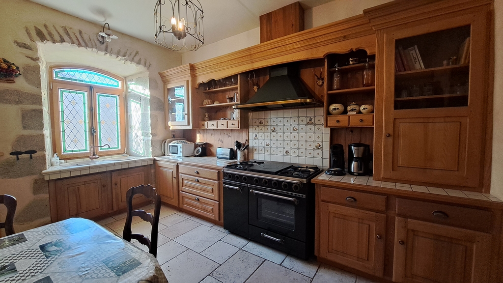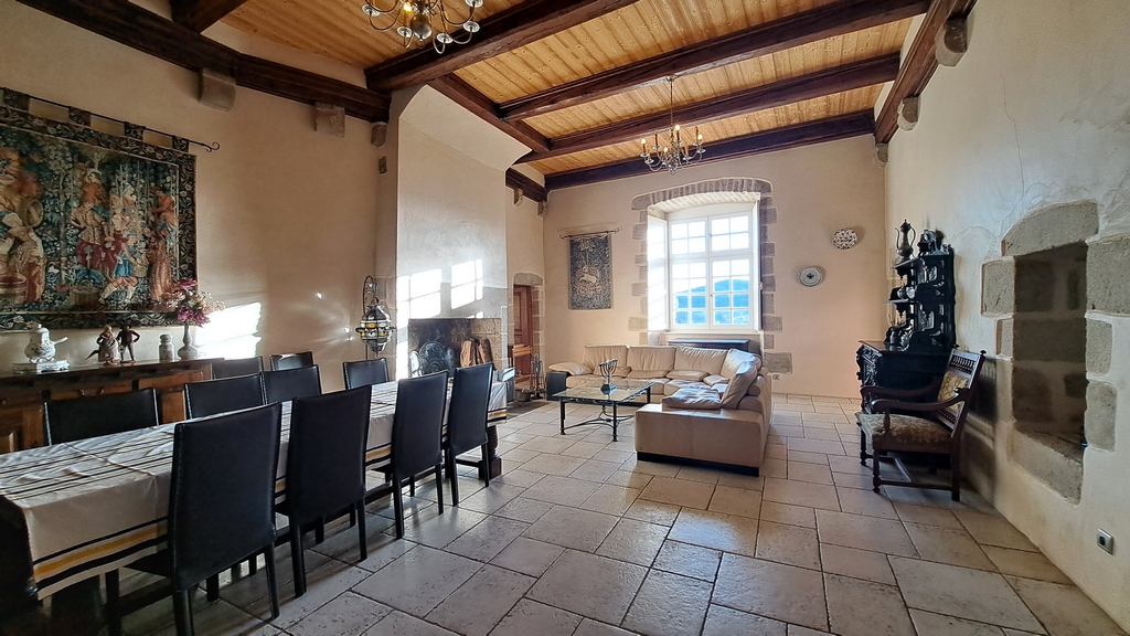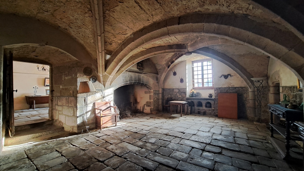 – un salon à double croisées d’ogives de 46,70 m² avec en son centre une clef de voûte à écusson. Cheminée monumentale. Ancien potager en pierre ;