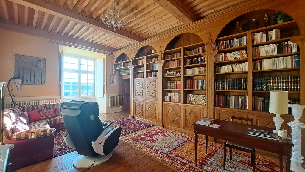 Au premier étage, un palier de 22,43 m² dessert un appartement T5 d’environ 174,37 m² comprenant un grand salon, une bibliothèque, trois chambres, une cuisine, une salle de bains et une salle d’eau.
