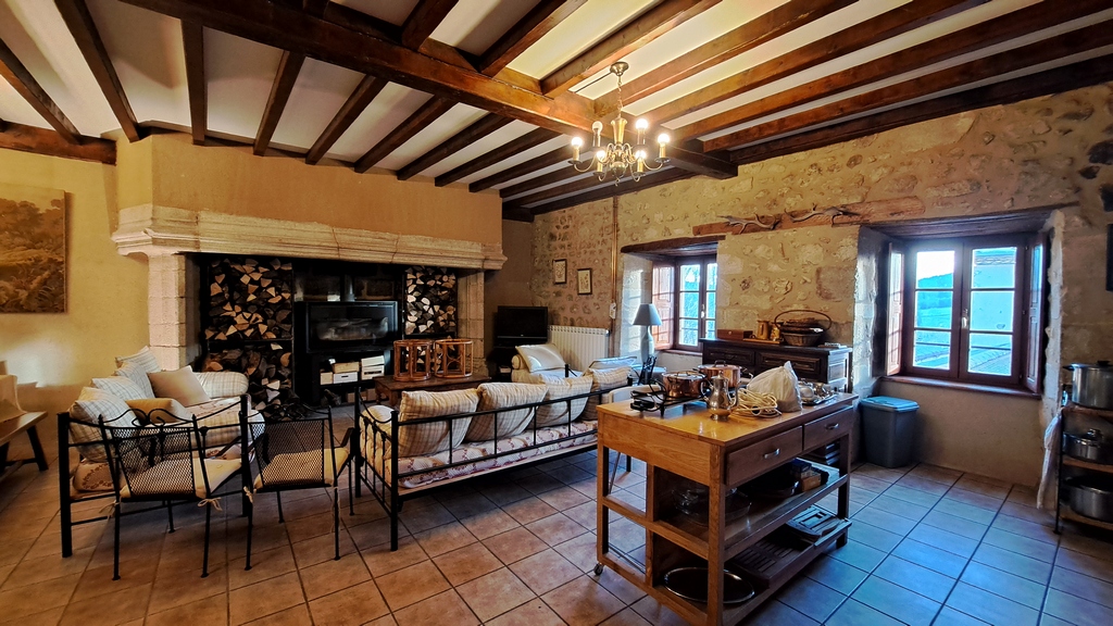 Au rez-de-chaussée aux normes PMR : un grand salon avec cheminée monumentale du XVe et cuisine ouverte, une buanderie, une chambre et sa salle d’eau.