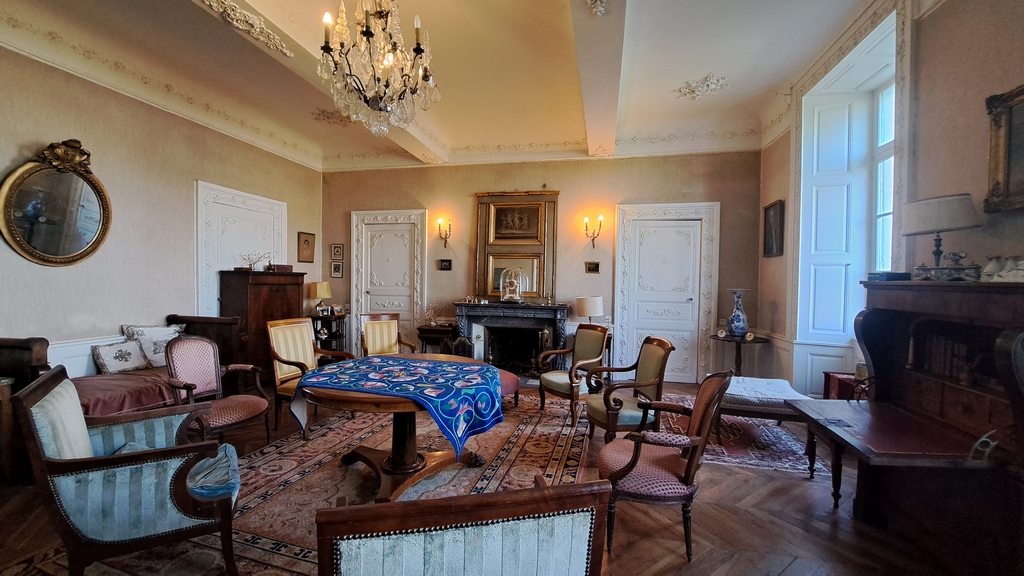 – le grand salon de 43,47 m². Cheminée en arbre gris aux pieds griffus. Parquet fougères. Portes et plafond richement décorés. Hauteur sous plafond : 3,5 mètres ;
