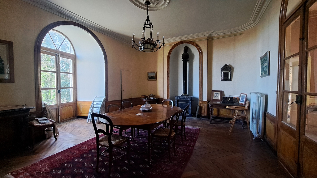 – la grande salle à manger de 27,67 m². Parquet à bâtons rompus. Un poêle dans une niche ;