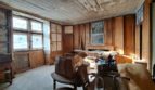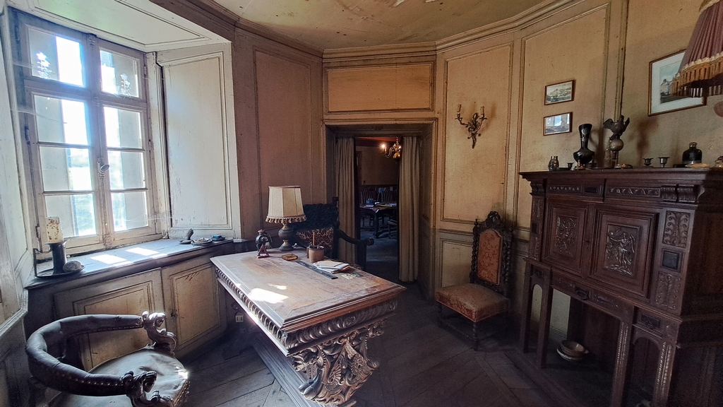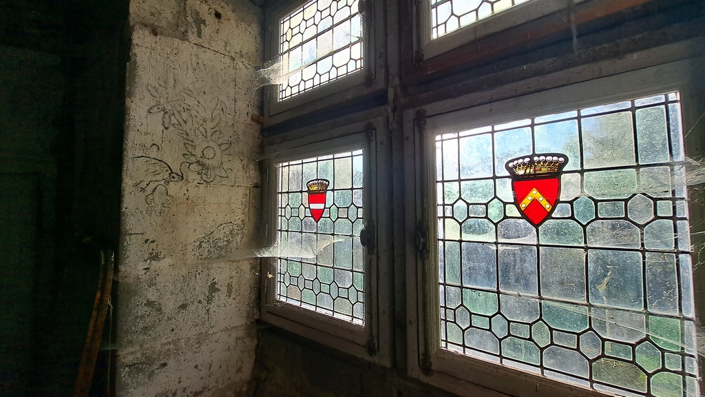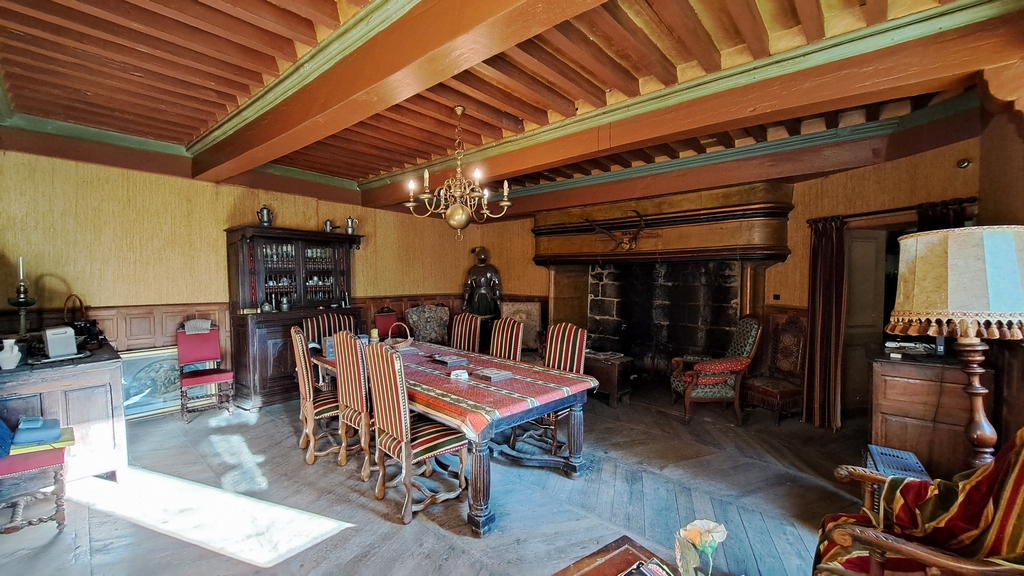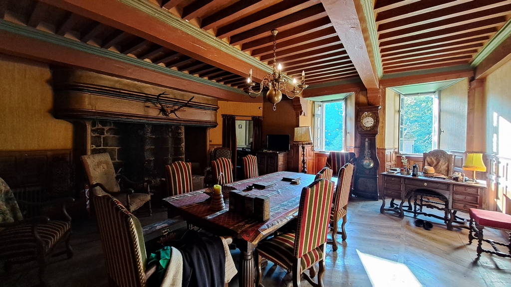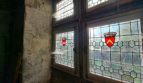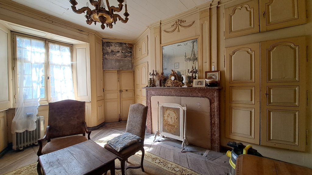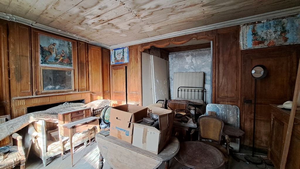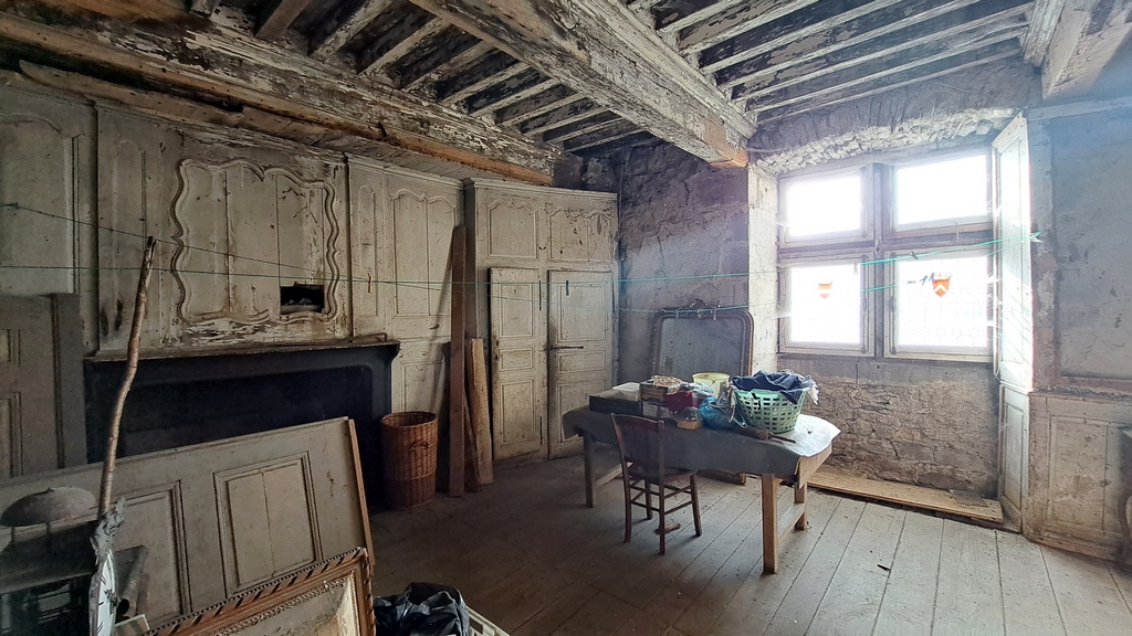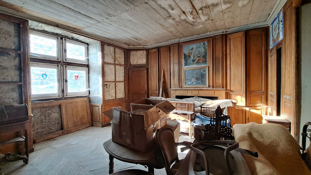 – Une chambre sud de 32,66 m² et ses boiseries XVIIIe. Plancher. Plafond à la Française. Cheminée bois. Vitraux armoriés. Traces de peintures XVIIe ;