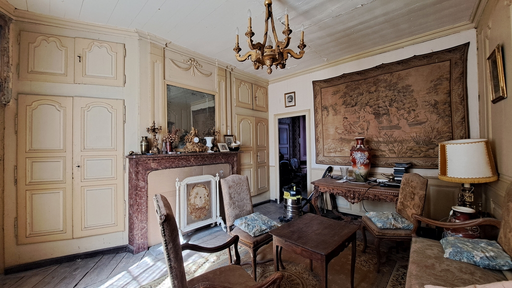 – Un petit salon ouest de 16,22 m² et ses boiseries XVIIIe. Parquet Fougère. Cheminée en bois imitation marbre. Un trumeau encadré de pilastres et orné d’un nœud ;