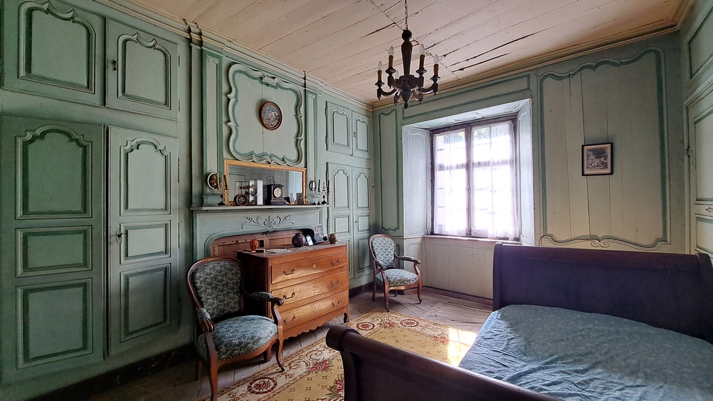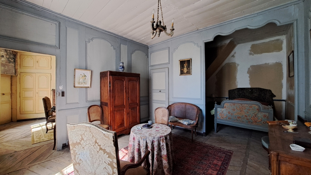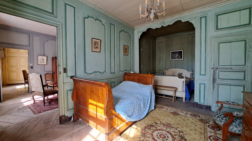 – Une chambre bleue est de 22,95 m² et ses boiseries avec alcôve XVIIIe. Parquet Fougère. Accès à l’étage à des latrines intactes et à un grenier de 60 m² ;