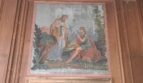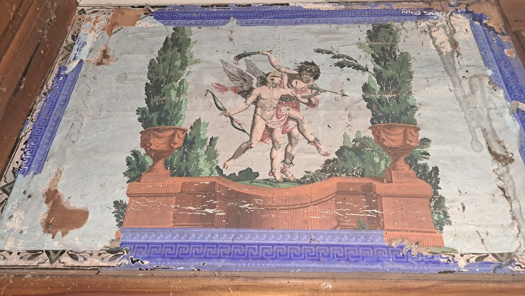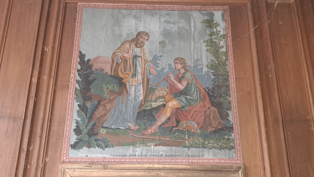 – Une chambre sud de 27,99 m² et son décor fin XVIIIe : des restes de papiers peints d’époque en trumeau représentant sur la cheminée un grand prêtre d’Apollon instruisant Télémaque et sur les portes de l’alcôve Cupidon . Parquet au point de Hongrie. Vitraux armoriés ;