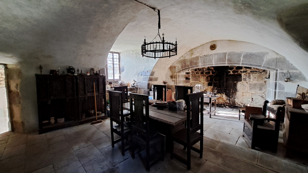 – L’ancienne cuisine sud de 32,63 m². Voûte en berceau. Sol en dalles de pierre. Cheminée monumentale d’une rare envergure sous un arc surbaissé. Potager et évier en pierre ;