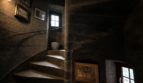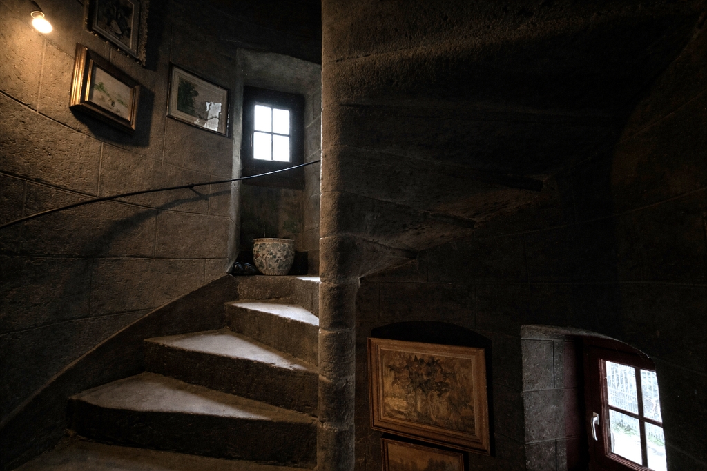 L’accès aux étages se fait par un large escalier en vis en pierre.