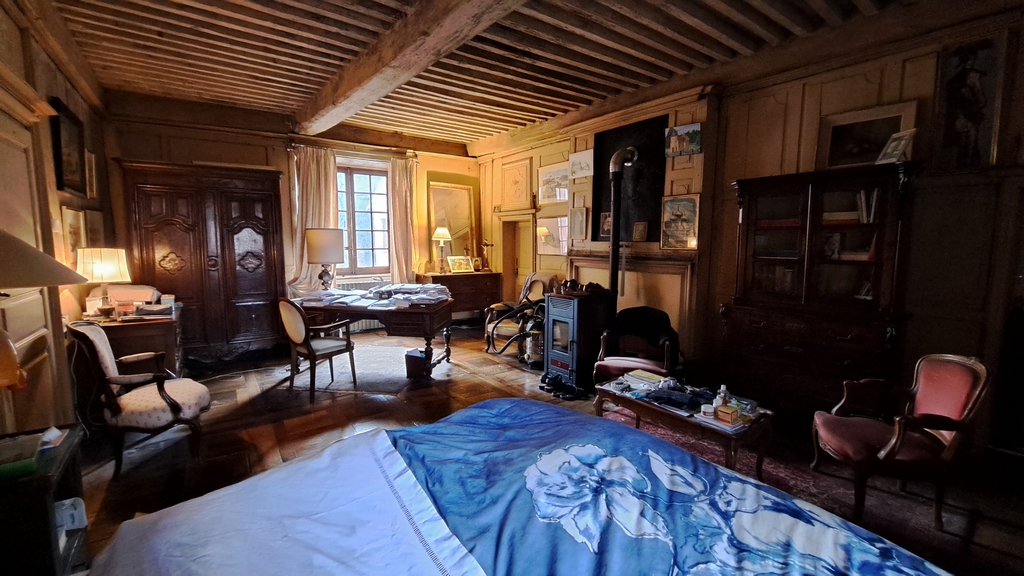 Au premier étage, une porte aux vitraux armoriés donne sur un couloir de 10,76 m² aux boiseries XVIIe qui dessert :