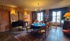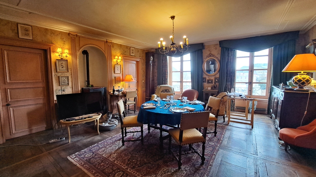 – Une salle à manger de 34,11 m². Une niche encadrée de deux pilastres aux chapiteaux ornés de couronnes de fleurs abrite un poêle. Parquet Versailles avec différentes essences de bois ; –