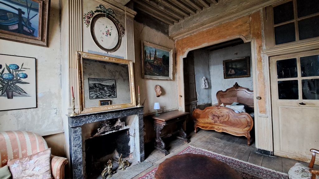 Au deuxième étage, à rénover entièrement, un couloir de 22,40 m² dessert cinq chambres dont une avec alcôve aynt conservé son décor XVIIIe.