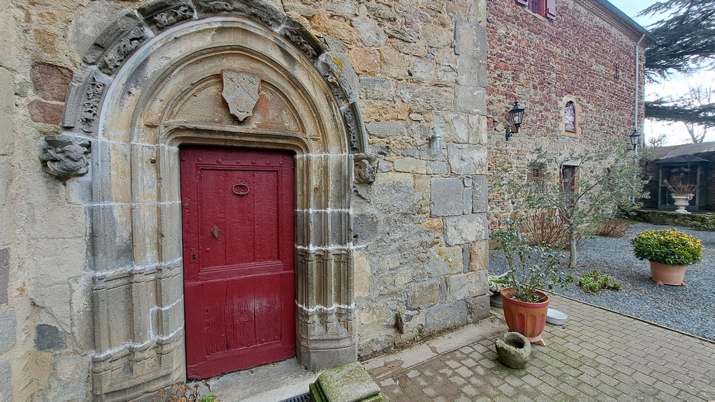 La porte de la tour d’escalier est ornée de deux culots sculptés supportant un arc brisé richement décoré à trois voussures. Au centre, un blason aux armes des barons Aubier de Condat, seigneurs de Condat, Rioux et Lamonteilhe, ses anciens propriétaires jusqu’en 1964.