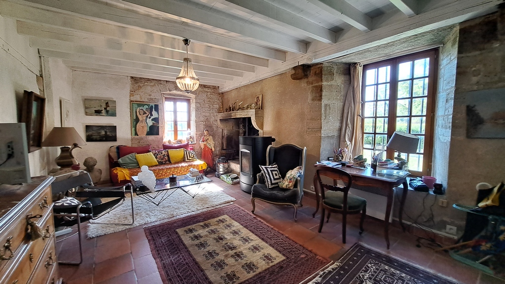 – un petit salon sud de 23,94 m². Cheminée en pierre avec poêle à granulés ;