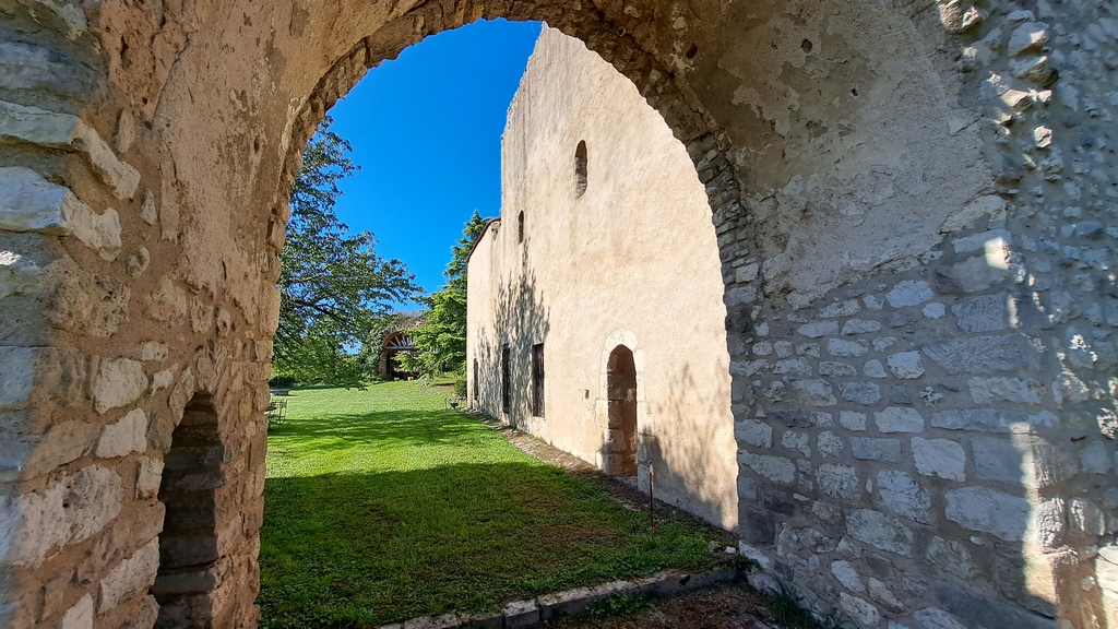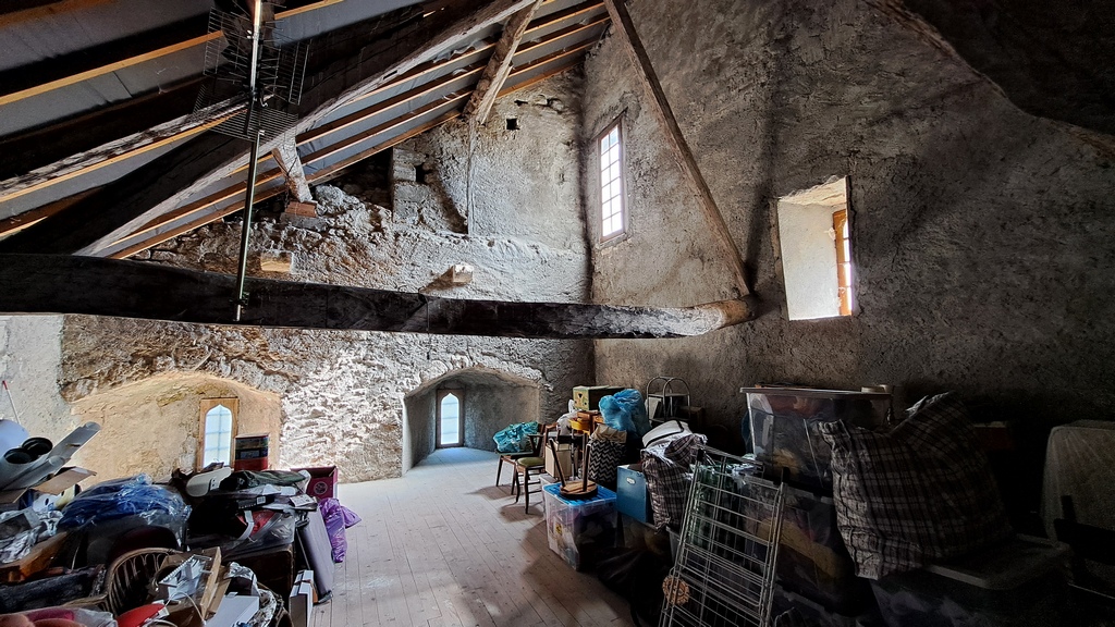 A l’est, une grande baie surmontée d’une arche gothique ouvre sur une terrasse, emplacement de l’abside de l’ancienne chapelle.
