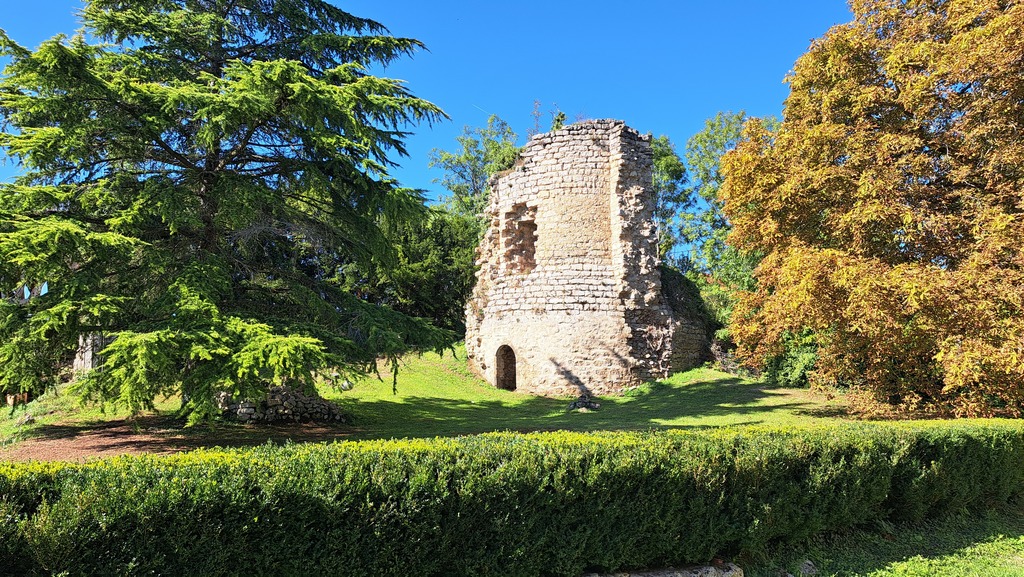 A l’ouest, les restes de l’ancien donjon carré, autrefois haut de 40 mètres, dont l’entrée-porche est aujourd’hui consolidée.